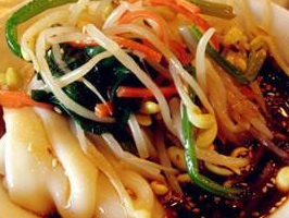 等蒸完面皮母親就切面皮了,母親喜歡把面皮切得細(xì)一些,制作調(diào)料的方式是母親自己發(fā)明的,姜事先用熱油澆過的,等油溫降下來時(shí),再加入蒜泥,攪拌均勻,辣椒也是現(xiàn)用熱油潑的,醋是用油鍋加入花椒和八角煮過的,光是廚房里彌漫的調(diào)料味,足以讓人流口水。母親一碗一碗給我們調(diào),我們圍坐在母親身邊吃著面皮,特有的獨(dú)一味的母親面皮。