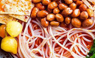 桂林米粉在米粉界得天獨厚的“霸主”地位。而桂林米粉的原主義吃法其實是干撈制法,澆頭也遠沒有肥腸、排骨、魚丸這么花哨,常見的反而是鍋燒、脆皮、炸黃豆干拌,一齊混上就算大功告成?芍^人間有味是清歡。